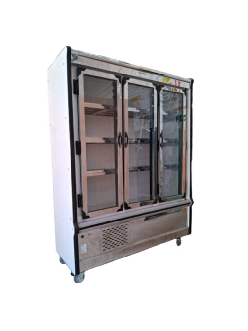 balcão auto serviço com 3 portas, lateral pintada, frente em inox, placa fria, pés com rodas e freios.