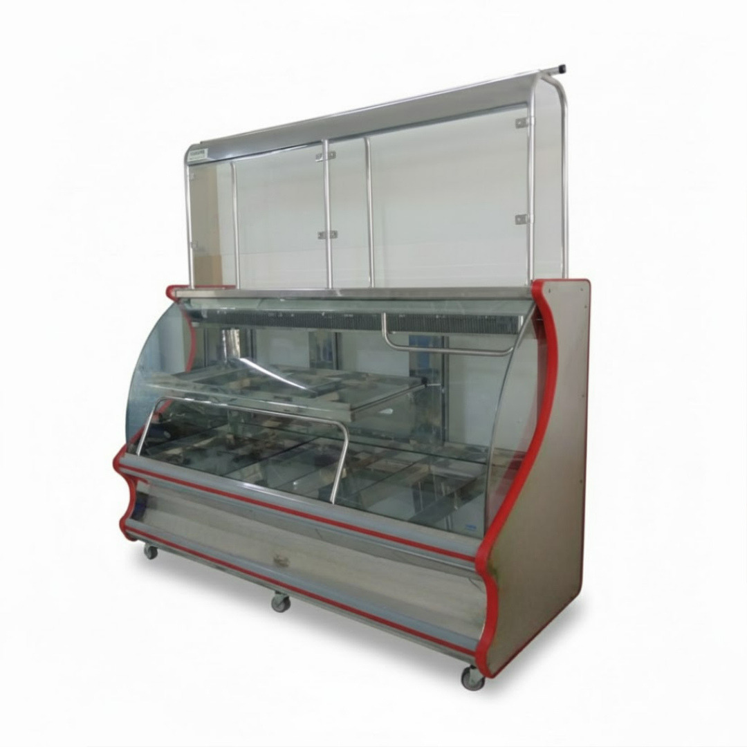 balcão frigorífico com tendal em inox, com 2 portas, vidro curvo, rodas multidirecionais com trava.