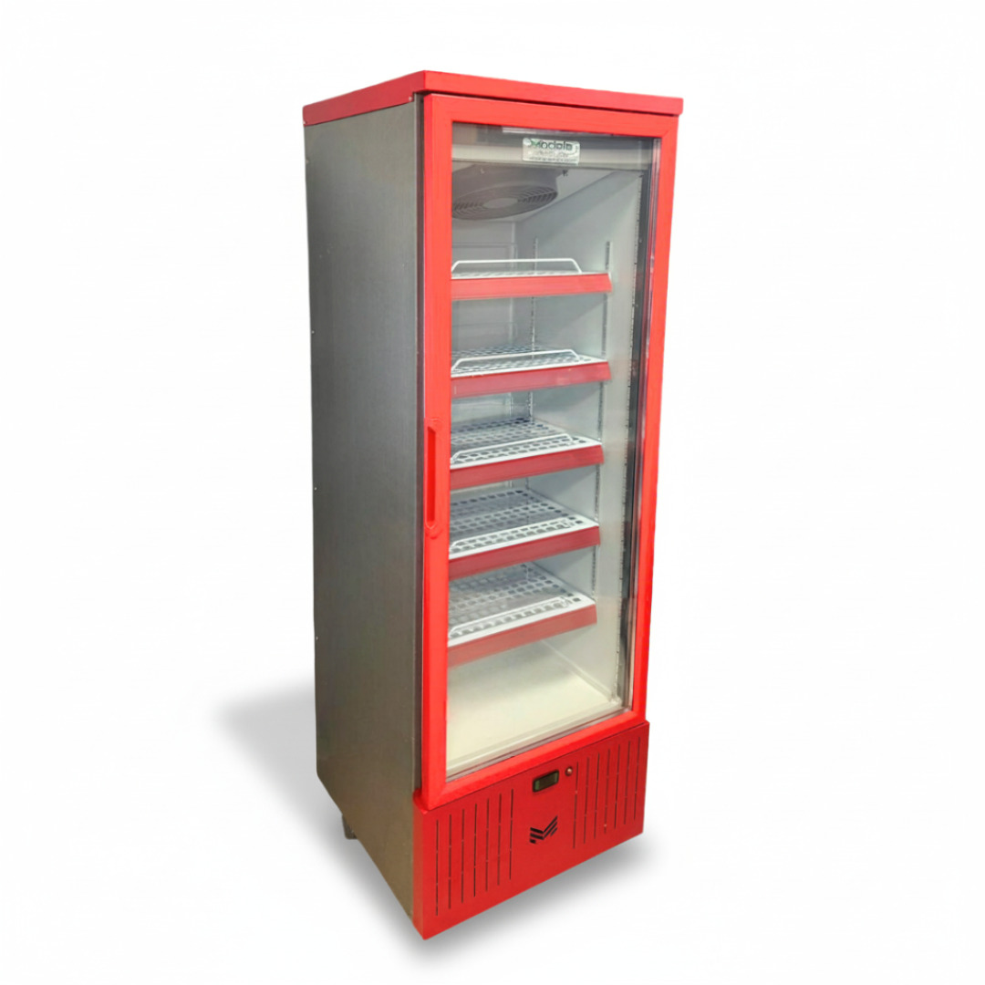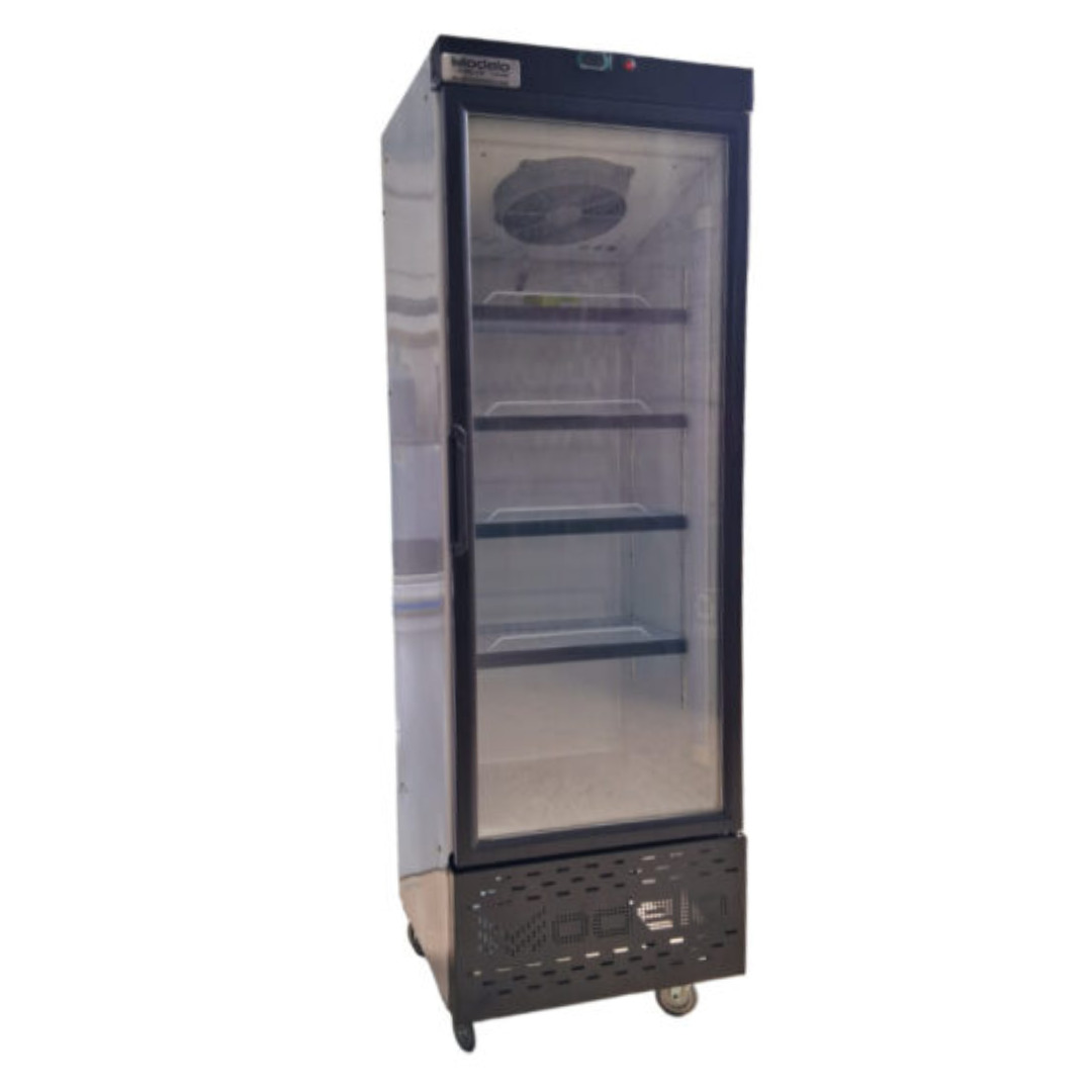 balcão refrigerado (VISA COOLER) com 1 porta, vidro duplo, ar forçado, pés com rodas e freios.