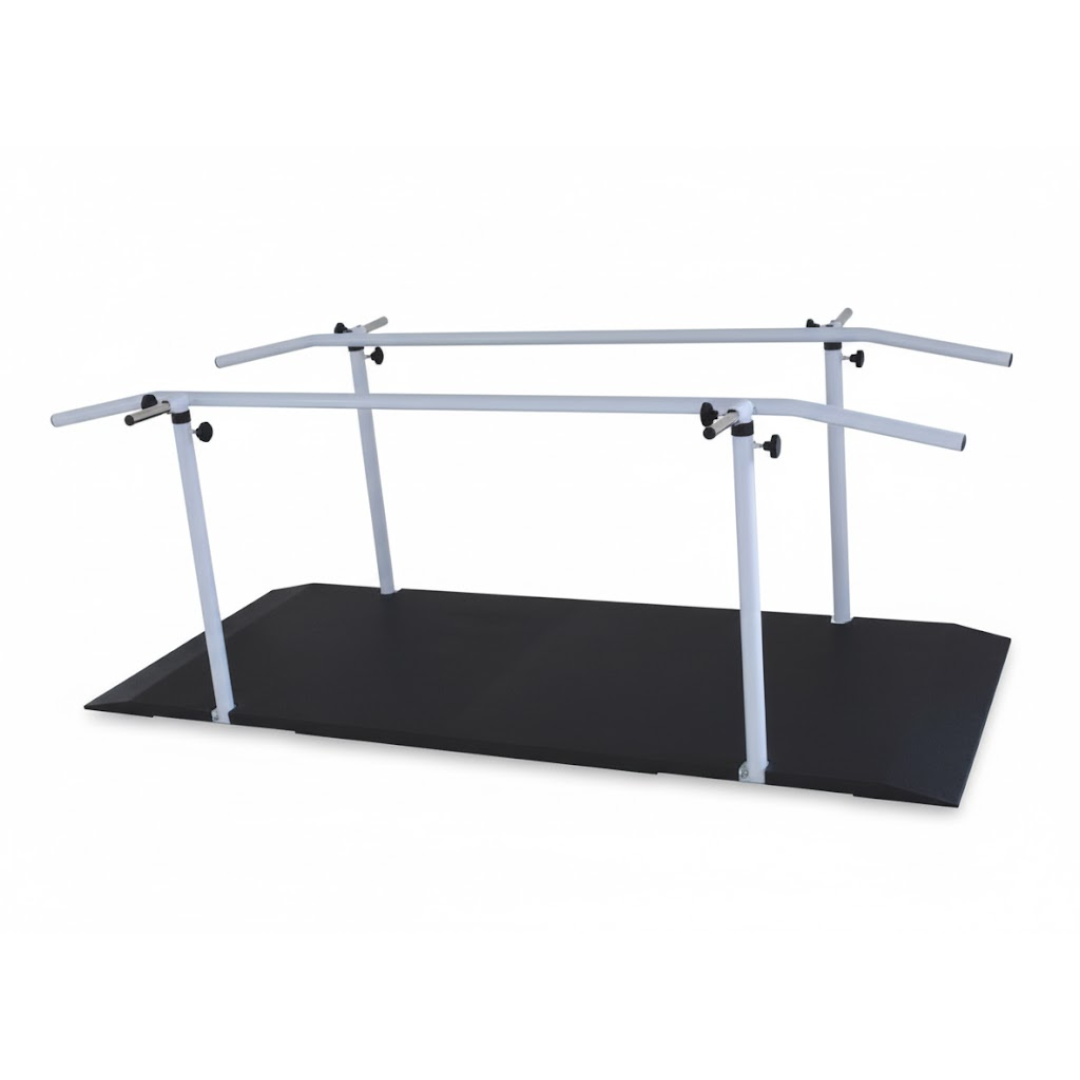 barra paralela, piso em compensado anti derrapante, corrimão em aço tubular, pintura epóxi, com regulagem