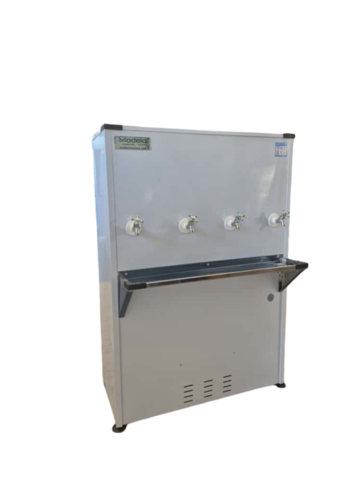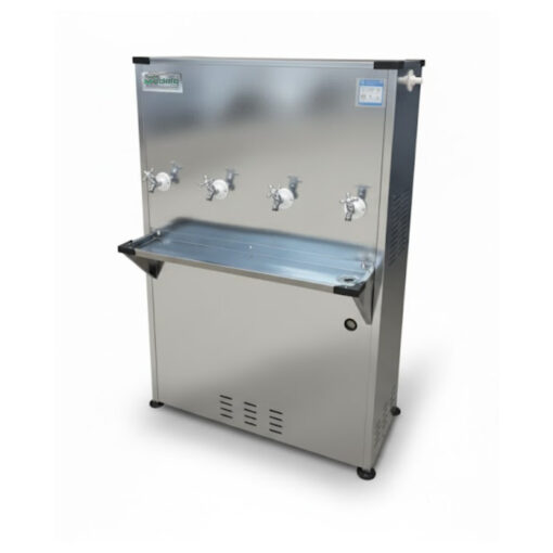 Bebedouro fabricado em chapa de aço galvanizada 0,40 mm. Estrutura tubular interna para reforço fabricada em metalon de aço carbono 20×20 0,90 mm. Estrutura metálica externa com pintura eletrostática pó cor branca. Possui reservatório de água com capacidade de armazenamento de 100 L de água, fabricado em chapa de aço inox 0,40 mm. Possui isolamento térmico em poliuretano, com alta resistência térmica e mecânica. Possui sistema de refrigeração direta da água, por meio de serpentina fabricada em tubo de aço inox 304. Suas conexões de entrada e saída de água são plásticas, fabricadas em polipropileno, totalmente atóxica. Possui bóia interna para controle do fluxo de entrada de água, com resistência de 100 Kpa. Posusi 04 (quatro) torneiras para saída de água fabricadas em latão, com acabamento cromado, e sistema de abertura em meia volta. Possui sistema de refrigeração com compressor de 167 W de potência, o que gera um sistema de alta eficiência energética de 0,034 KwH/l e fornecimento de água gelada (vazão) de 8,00 L/h. Sistema de refrigeração com fluido refrigerante R-134A ecológico. Cabo com tomada com pino para aterramento centralizado. O bebedouro possui bandeja para copo fabricada em aço inox 0,40 mm, com drenagem da água de descarte do abastecimento de copo para sifão com conexão roscada. O bebedouro possui cantoneiras plásticas para evitar riscos durante a operação do mesmo. Possui 04 (quatro) pés niveladores em polipropileno, com altura regulável para adequação em superfícies irregulares do piso. Possui dimensões de 1,31X0,90X0,58 M (ALTxCOMPXPROF). Bebedouro certificado. Garantia de 6 (seis) meses a partir da data de emissão de nota fiscal e assistência técnica na fábrica.