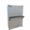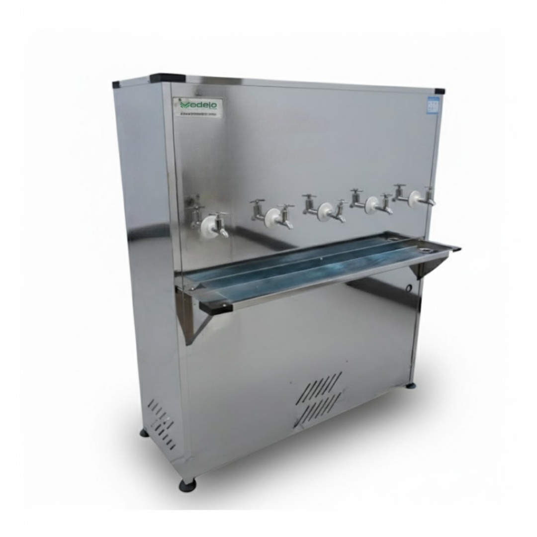 Bebedouro fabricado em chapa de aço galvanizada 0,40 mm. Estrutura tubular interna para reforço fabricada em metalon de aço carbono 20×20 0,90 mm. Estrutura metálica externa com pintura eletrostática pó cor branca. Possui reservatório de água com capacidade de armazenamento de 150 L de água, fabricado em chapa de aço inox 0,40 mm. Possui isolamento térmico em poliuretano, com alta resistência térmica e mecânica. Possui sistema de refrigeração direta da água, por meio de serpentina fabricada em tubo de aço inox 304. Suas conexões de entrada e saída de água são plásticas, fabricadas em polipropileno, totalmente atóxica. Possui bóia interna para controle do fluxo de entrada de água, com resistência de 100 Kpa. Posusi 05 (cinco) torneiras para saída de água fabricadas em latão, com acabamento cromado, e sistema de abertura em meia volta. Possui sistema de refrigeração com compressor de 167 W de potência, o que gera um sistema de alta eficiência energética de 0,027 KwH/l e fornecimento de água gelada (vazão) de 13,208 L/h. Sistema de refrigeração com fluido refrigerante R-134A ecológico. Cabo com tomada com pino para aterramento centralizado. O bebedouro possui bandeja para copo fabricada em aço inox 0,40 mm, com drenagem da água de descarte do abastecimento de copo para sifão com conexão roscada. O bebedouro possui cantoneiras plásticas para evitar riscos durante a operação do mesmo. Possui 04 (quatro) pés niveladores em polipropileno, com altura regulável para adequação em superfícies irregulares do piso. Possui dimensões de 1,31X1,18X0,58 M (ALTxCOMPXPROF). Bebedouro certificado. Garantia de 6 (seis) meses a partir da data de emissão de nota fiscal e assistência técnica na fábrica.