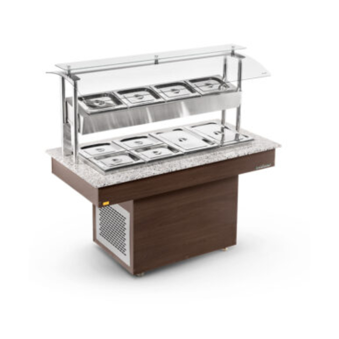 buffet restaurante quente / frio, cubas em inox, sendo; 8 quentes e 4 frias, tampo em granito, estrutura em MDF, pés com rodas.