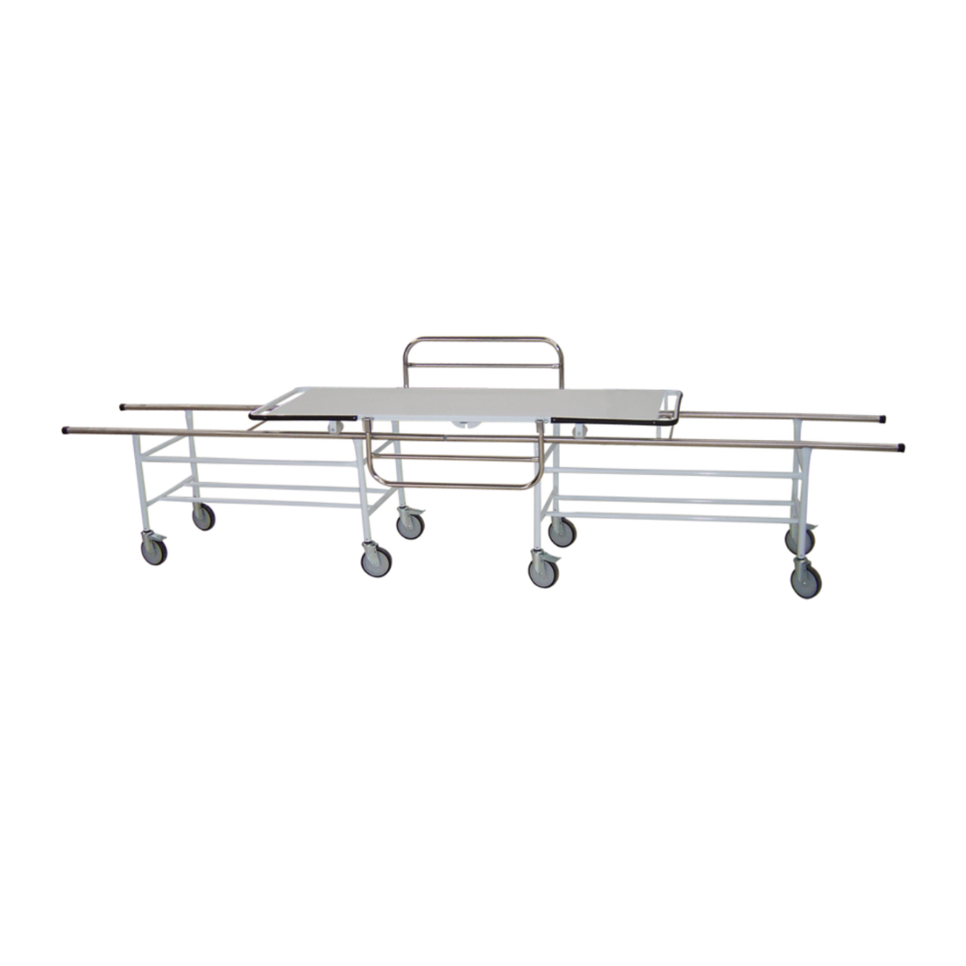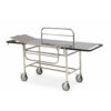 carro maca de transferência para centro cirugico, estrutura tubular inóx, grade lateral, leito em inóx, composto por 1 leito e 2 carros, travas de segurança, sistema de deslizamento através de roldanas de nylon, borracha de proteção, suporte de suro em inóx, rodízios de 5″.