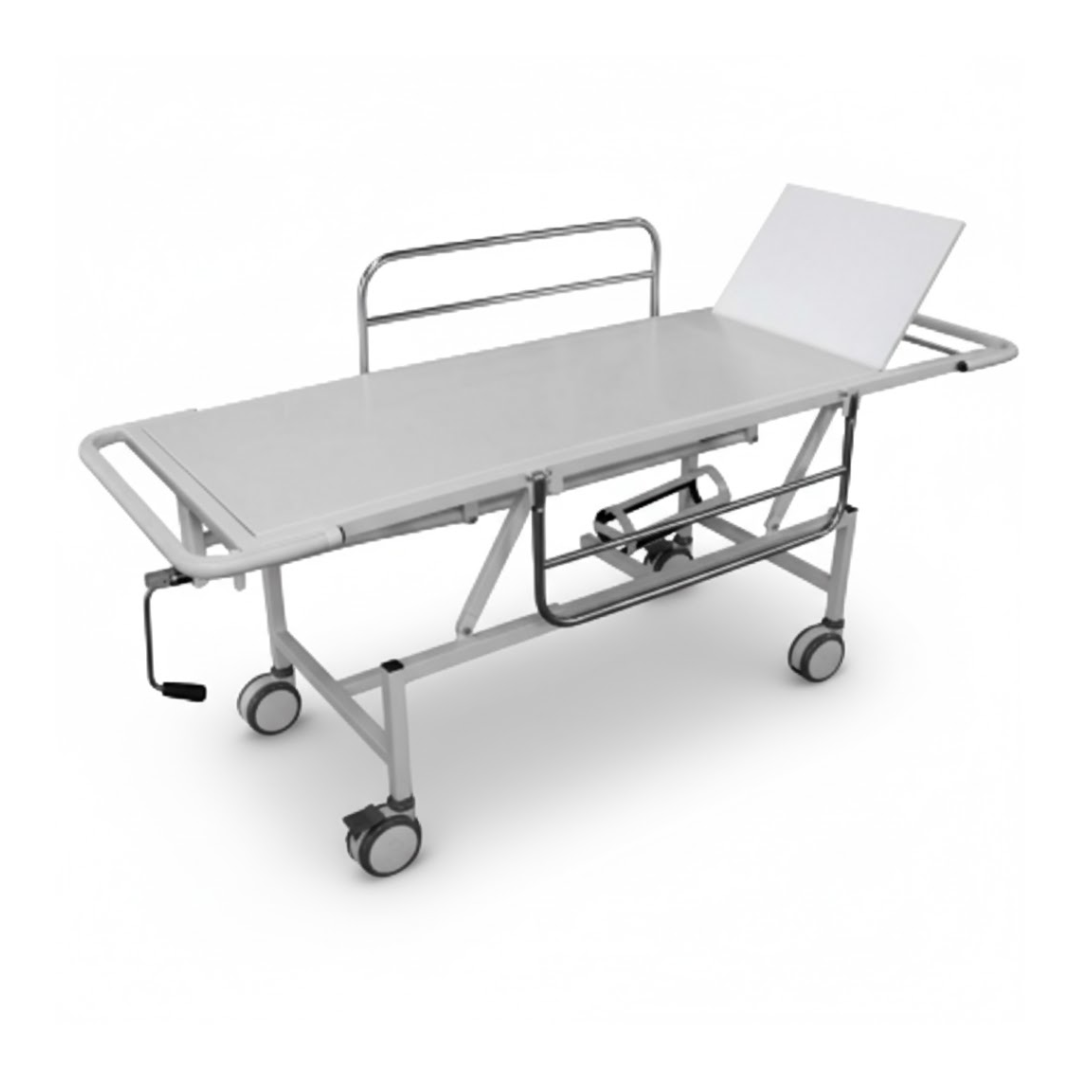 carro maca leito regulável (movimentos feitos por manivela) estrutura em aço tubular pintado em epóxi, grade lateral móvel, rodízio, borracha de proteção, suporte para soro, leito estofado ou em chapa.