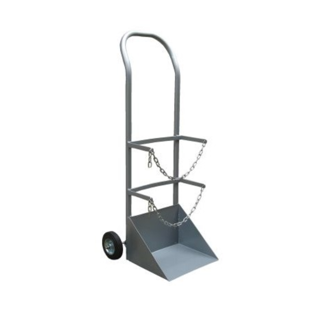 carro para transporte de cilindro de oxigenio em estrutura tubular de aço, rodizio, corrente de fixação.
