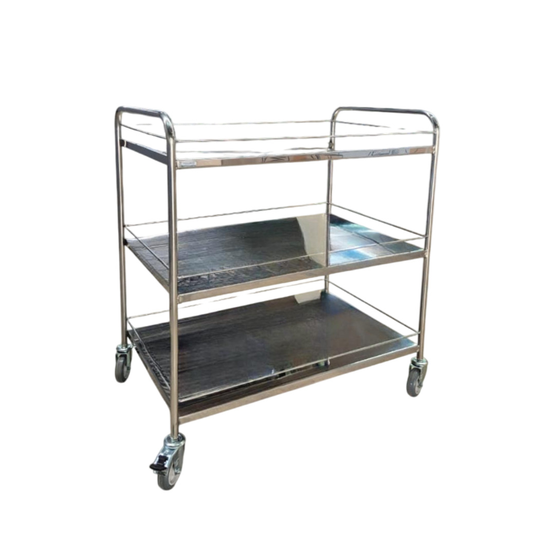carro para transporte de bandejas, com 3 prateleiras pintadas, rodízios, borracha lateral de proteção.