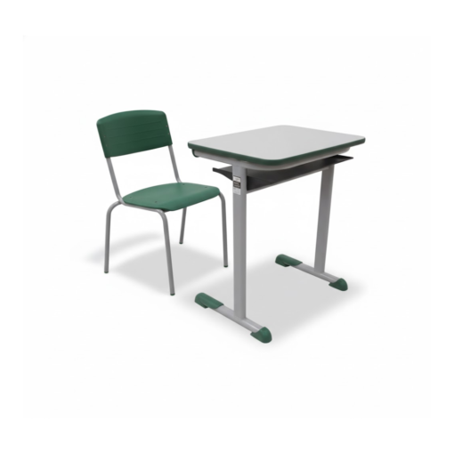 CONJUNTO DO ALUNO COMPOSTO DE 1 (UMA) MESA E 1 (UMA) CADEIRA, CERTIFICADO PELO INMETRO, E EM CONFORMIDADE COM A NORMA ABNT ABNT NBR 14006:2008 – MÓVEIS ESCOLARES – CADEIRAS E MESAS PARA CONJUNTO ALUNO INDIVIDUAL. MESA INDIVIDUAL COM TAMPO EM MDP OU MDF, REVESTIDO NA FACE SUPERIOR EM LAMINADO MELAMÍNICO E NA FACE INFERIOR EM CHAPA DE BALANCEAMENTO, MONTADO SOBRE ESTRUTURA TUBULAR DE AÇO, CONTENDO PORTA-LIVROS EM PLÁSTICO INJETADO. CADEIRA INDIVIDUAL EMPILHÁVEL COM ASSENTO E ENCOSTO EM POLIPROPILENO INJETADO MOLDADO, MONTADOS SOBRE ESTRUTURA TUBULAR DE AÇO. ALTURA DO ALUNO: DE 1,46m a 1,76m COR VERDE