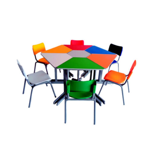 conjunto infantil coletivo trapézio, mesa em MDF colorido, cadeiras com assento e  encosto em PVC. estrutua em aço tubular com pintura epóxi  anticorrosivo.