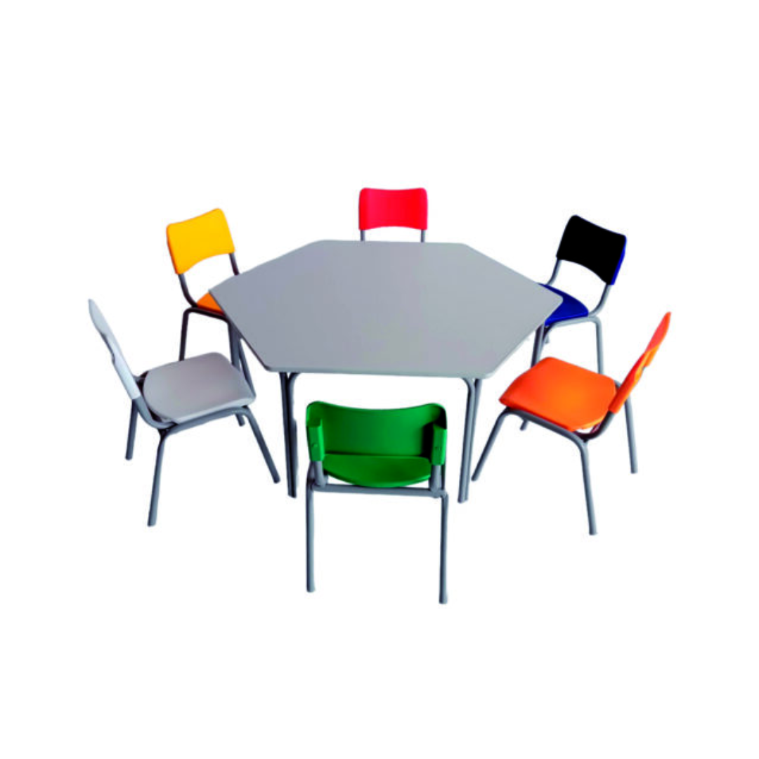 conjunto infantil coletivo hexagonal mesa em MDF, cadeiras com assento e encosto coloridos em PVC, com estrutura em aço tubular com pintura epóxi e anticorrosivo.