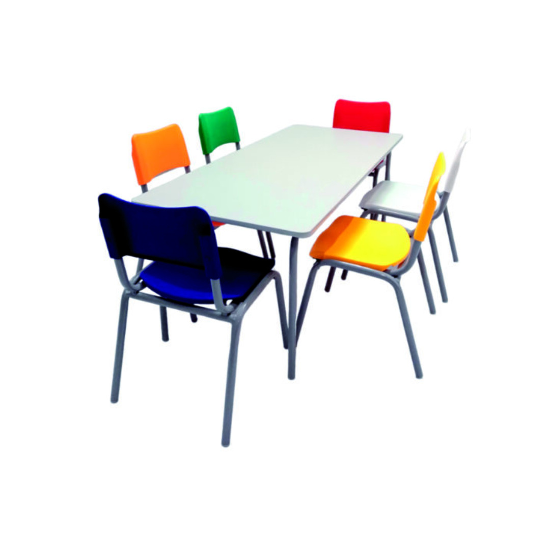 conjunto infantil para refeitório, mesa com tampo em MDF, estrutura em aço tubular com pintura epóxi, cadeiras com assento e encosto em PVC coloridos.