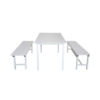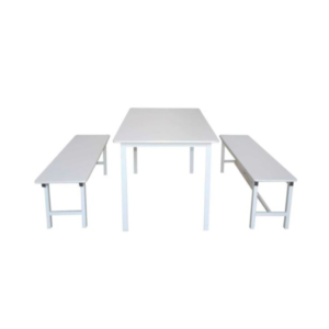 conjunto refeitório como 4 CADEIRAS FIXA com assento e encosto em PVC, estrutura em aço tubular, pintura epóxi com tratamento antiferrugem, tampo da mesa em MDF.