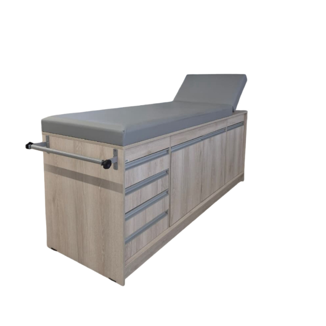 Divã luxo, estrutura em MDF, com 2 portas e 3 gavetas, 1 prateleira, leito estofado coberto em napa, com porta papel.