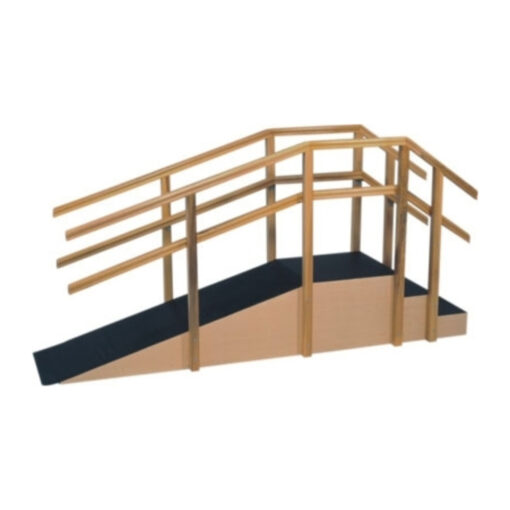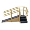 escada reta, rampa em compensado, piso antiderrapante, corrimão duplo em madeira.
