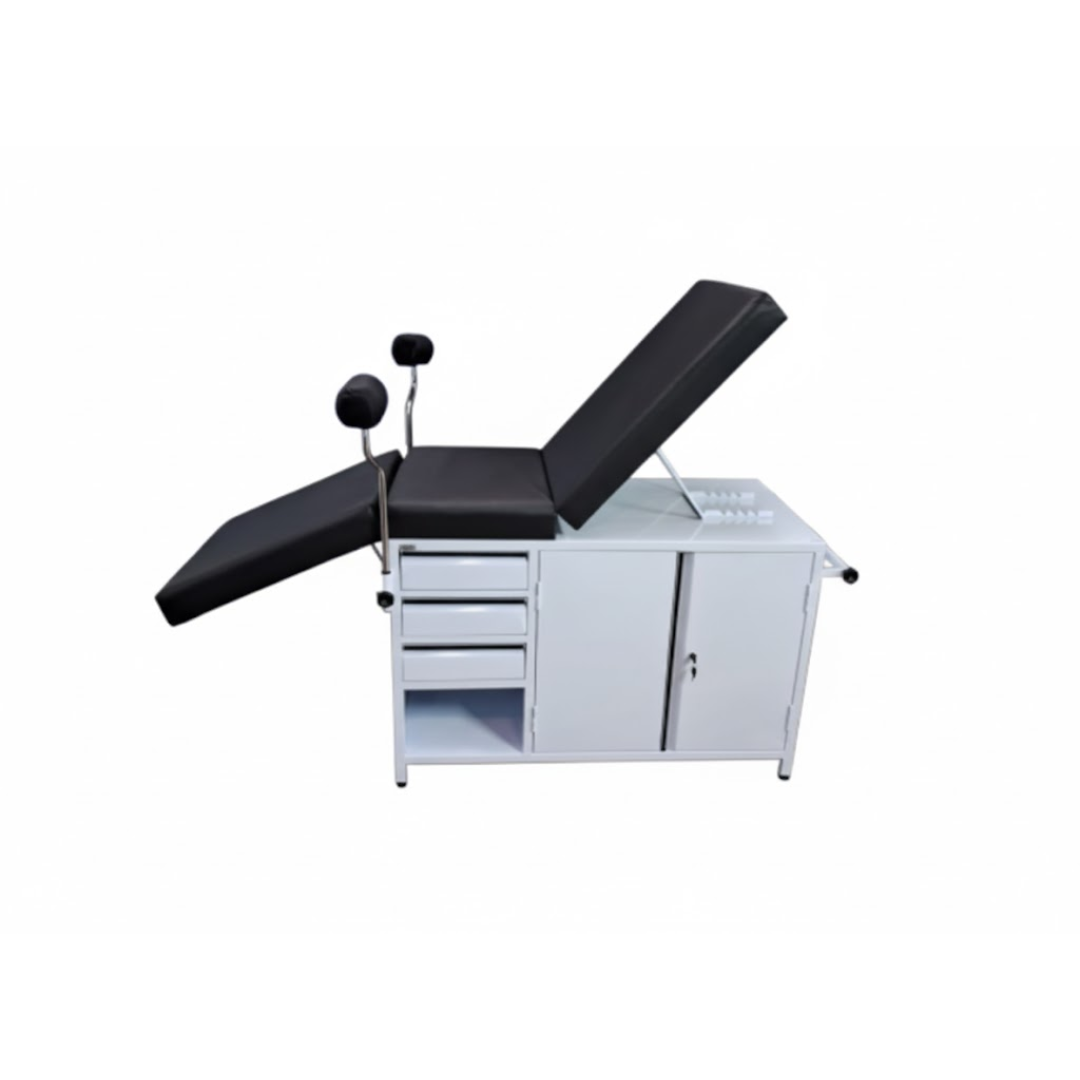 mesa ginecológica em gabinete de aço tipo luxo, com 2 portas, 3 gavetas, prateleira interna, porta coxas estofadas, leito estofado coberto em napa.