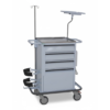 mesa para refeição em estrutura tubular em aço, pintura epóxi, rodas multidirecionais, tampo em MDF, altura regulável por manivela