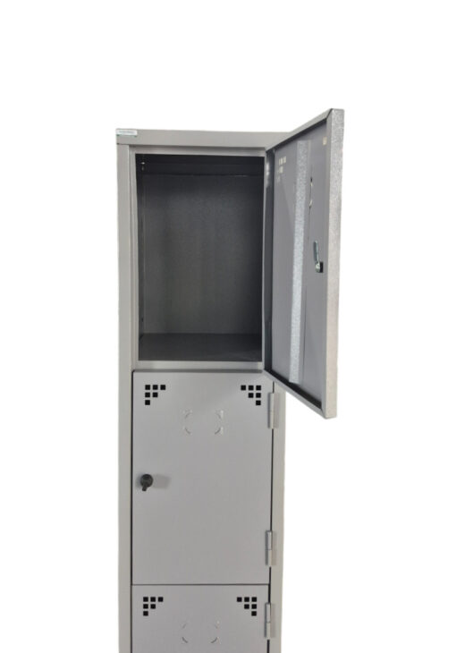 Roupeiro de aço fabricado em chapa de aço carbono 0,45 mm. Sua estrutura é composta de gabinete em chapa de aço carbono 0,45 mm, 01 par de dobradiças metálicas fabricadas em chapa de aço carbono 0,90 mm com vergalhão 4,2 mm embutido na estrutura da dobradiça e porta com estrutura metálica em chapa 0,90 para fechamento com cadeado (pitão). Possui 04 (quatro) portas de 46 x 29,5 cm fabricadas em chapa de aço carbono, com perfilhamento em “U” em suas extremidades, 01 par de arejadores estampados na porta, na lateral esquerda da porta, dispostos no topo superior e inferior da mesma e 01 porta-cartão estampado em sua estrutura metálica, para identificação. Roupeiro com tratamento de superfície metálica fosfatizado com zinco e pintura eletrostática pó cor cinza texturizada, com alta resistência a umidade e intempéries. Possui ainda 04 (quatro) pés em sapata niveladora de 2×1/2’’, com altura regulável, para adequação ao nivelamento do piso. Cada divisão do roupeiro possui cubagem de 54.280 cm³, com espaço para capacete. Dimensões de 195x35x40 cm (Alt x Comp x Prof). Garantia de 12 meses.