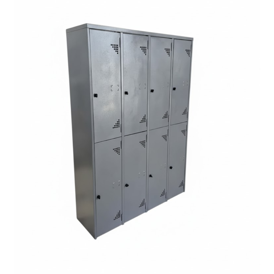 Roupeiro de aço fabricado em chapa de aço carbono 0,45 mm. Sua estrutura é composta de gabinete em chapa de aço carbono 0,45 mm, 01 par de dobradiças metálicas fabricadas em chapa de aço carbono 0,90 mm com vergalhão 4,2 mm embutido na estrutura da dobradiça e porta com estrutura metálica em chapa 0,90 para fechamento com cadeado (pitão). Possui 08 (oito) portas de 92 x 29,5 cm fabricadas em chapa de aço carbono, com perfilamento em “U” em suas extremidades, 01 par de arejadores estampados na porta, na lateral esquerda da porta, dispostos no topo superior e inferior da mesma e 01 porta-cartão estampado em sua estrutura metálica, para identificação. Roupeiro com tratamento de superfície metálica fosfatizado com zinco e pintura eletrostática pó cor cinza texturizada, com alta resistência a umidade e intempéries. Possui ainda 04 (quatro) pés em sapata niveladora de 2×1/2’’, com altura regulável, para adequação ao nivelamento do piso. Cada divisão do roupeiro possui cubagem de 108.560 cm³, com espaço para capacete. Dimensões de 195x132x40 cm (Alt x Comp x Prof). Garantia de 12 meses.